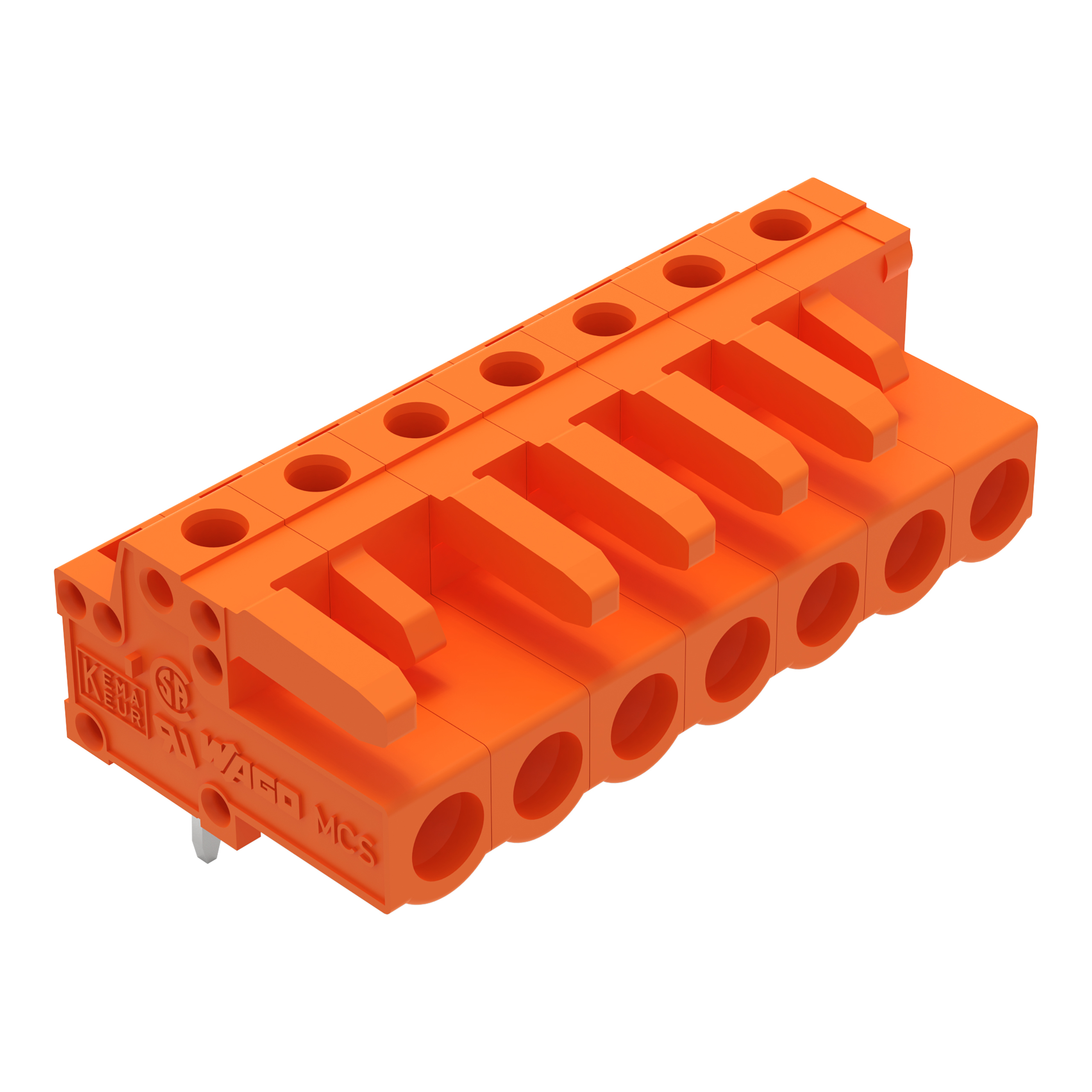 gniazdo THT; konstrukcja kątowa; raster 5,08 mm; 7-bieg.; pin lutowniczy 0,6 x 1,0 mm; pomarańczowy