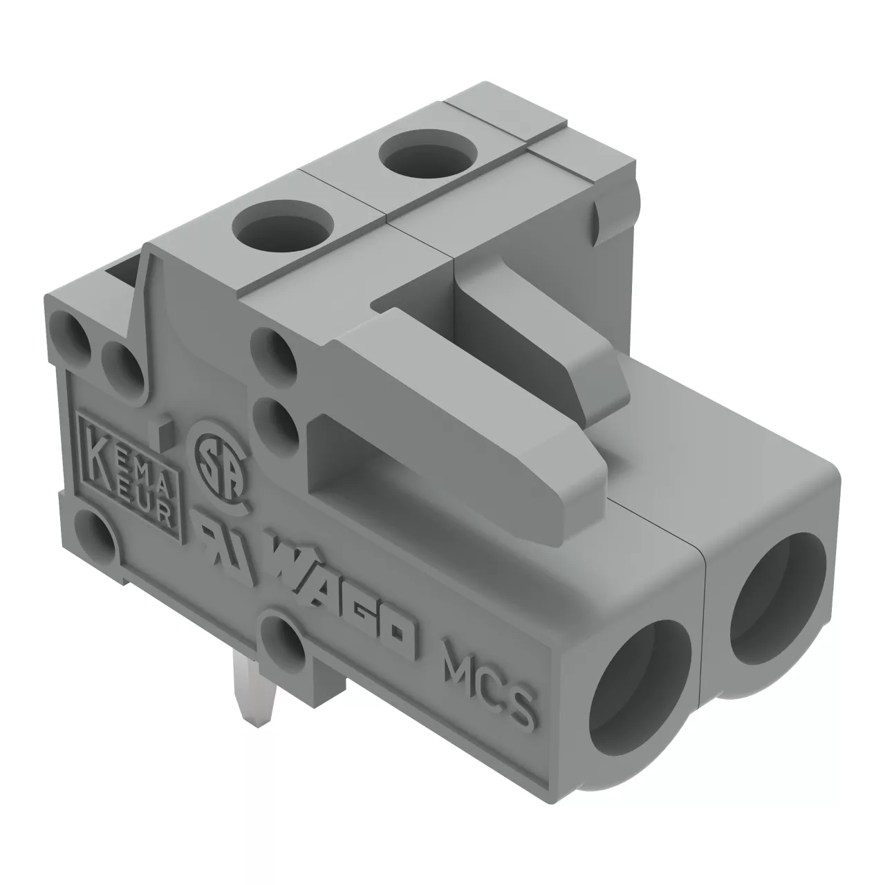 gniazdo THT; konstrukcja kątowa; raster 5 mm; 2-bieg.; pin lutowniczy 0,6 x 1,0 mm; szary