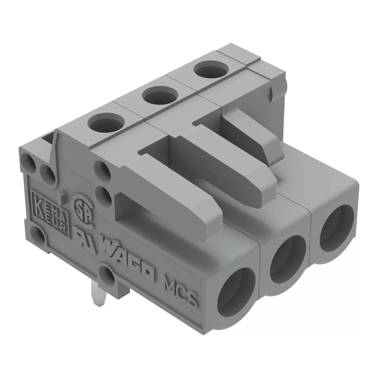 gniazdo THT; konstrukcja kątowa; raster 5 mm; 3-bieg.; pin lutowniczy 0,6 x 1,0 mm; szary