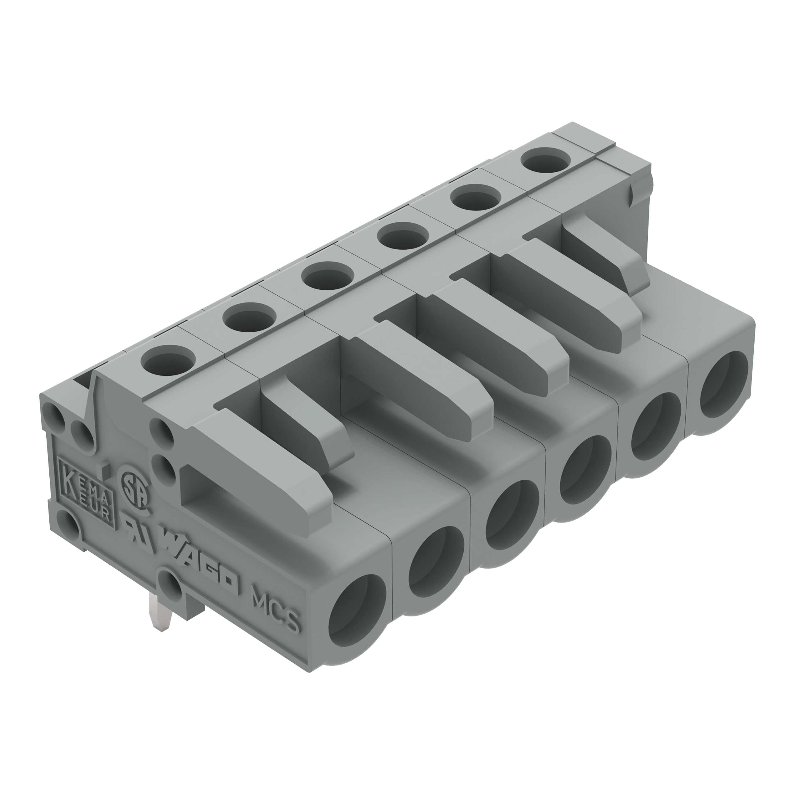 gniazdo THT; konstrukcja kątowa; raster 5 mm; 6-bieg.; pin lutowniczy 0,6 x 1,0 mm; szary