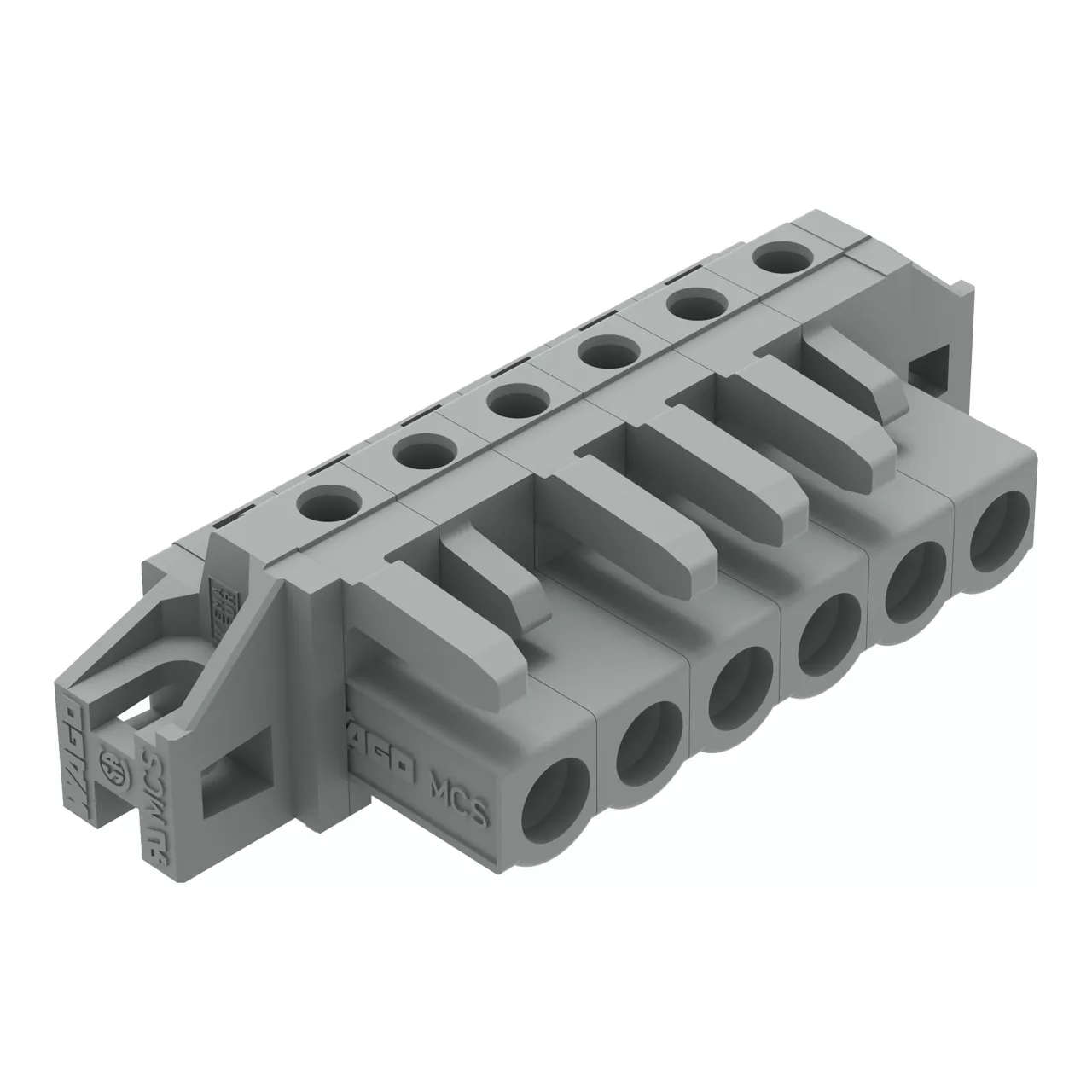 gniazdo THT; konstrukcja kątowa; raster 5 mm; 6-bieg.; kołnierz mocujący; pin lutowniczy 0,6 x 1,0 mm; szary