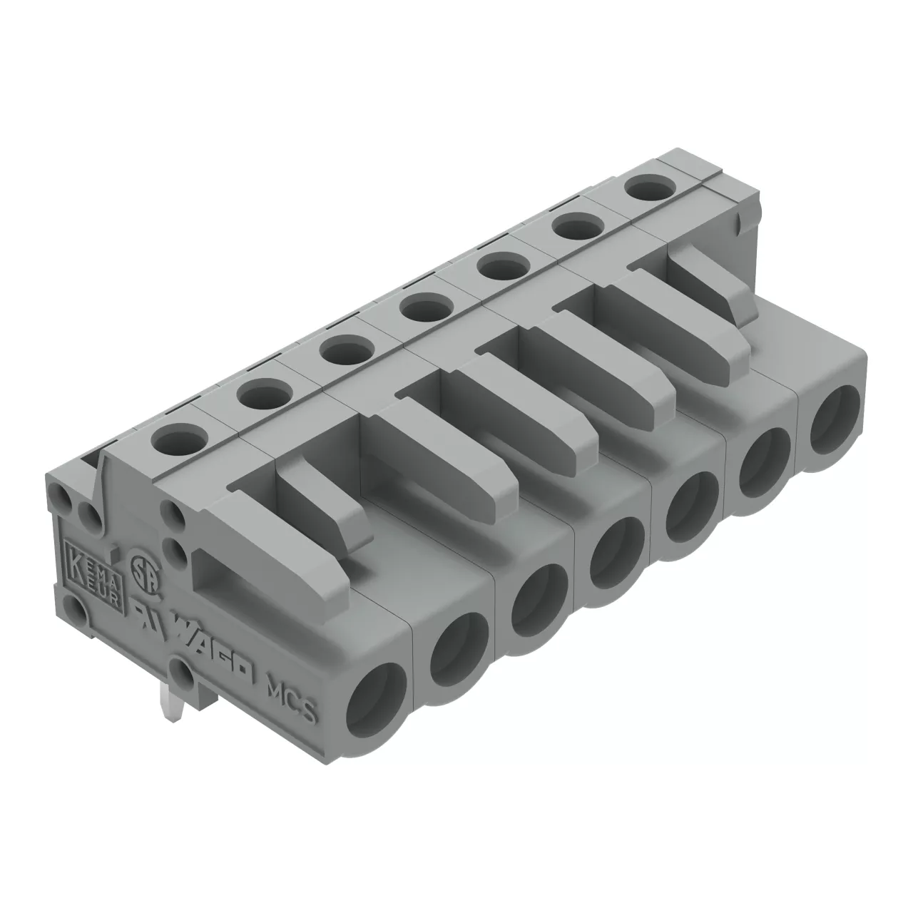 gniazdo THT; konstrukcja kątowa; raster 5 mm; 7-bieg.; pin lutowniczy 0,6 x 1,0 mm; szary