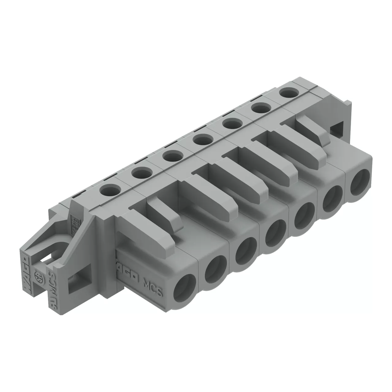 gniazdo THT; konstrukcja kątowa; raster 5 mm; 7-bieg.; kołnierz mocujący; pin lutowniczy 0,6 x 1,0 mm; szary