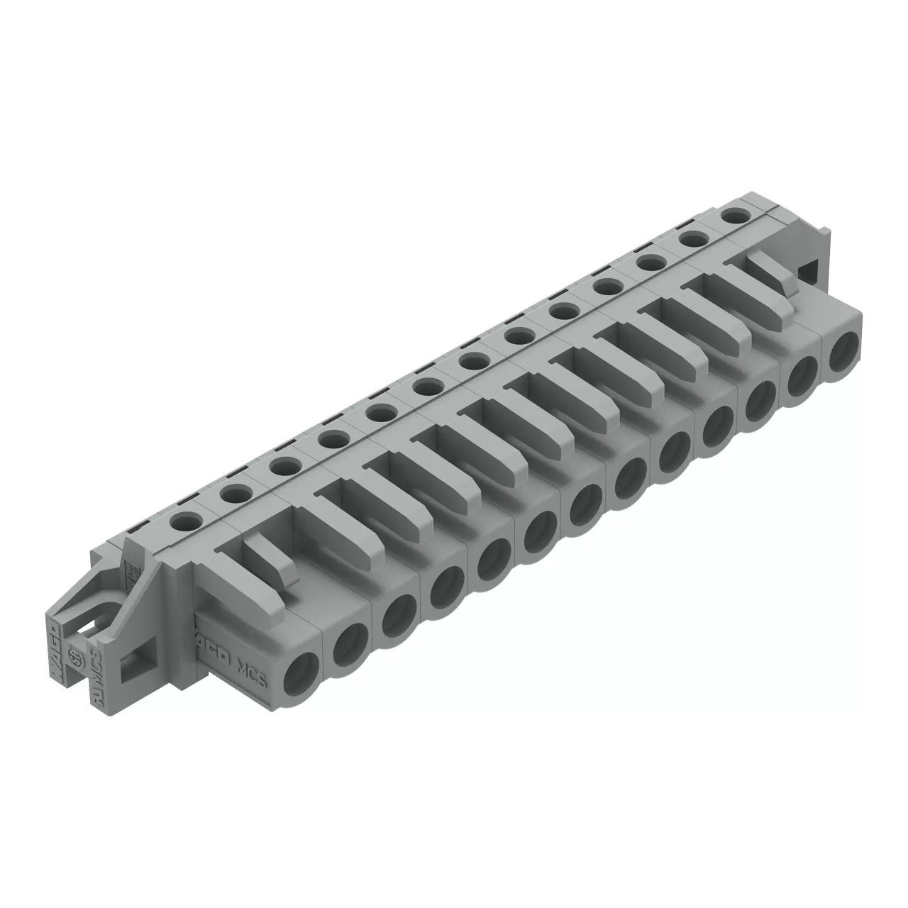 gniazdo THT; konstrukcja kątowa; raster 5 mm; 13-bieg.; kołnierz mocujący; pin lutowniczy 0,6 x 1,0 mm; szary
