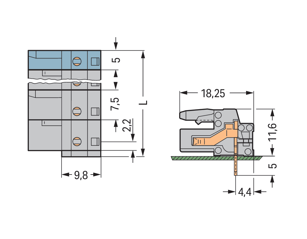 gniazdo THT; konstrukcja kątowa; raster 7,5 mm; 5-bieg.; pin lutowniczy 0,6 x 1,0 mm; szary