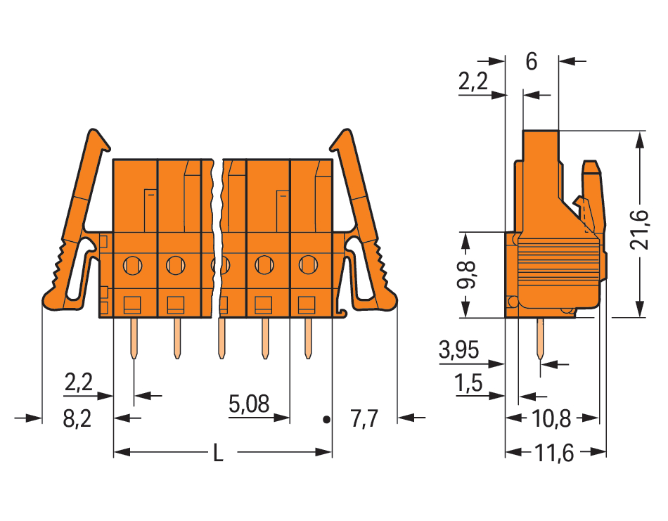 gniazdo THT; konstrukcja prosta; raster 5,08 mm; 21-bieg.; zaczep ryglujący; pin lutowniczy 0,6 x 1,0 mm; pomarańczowy