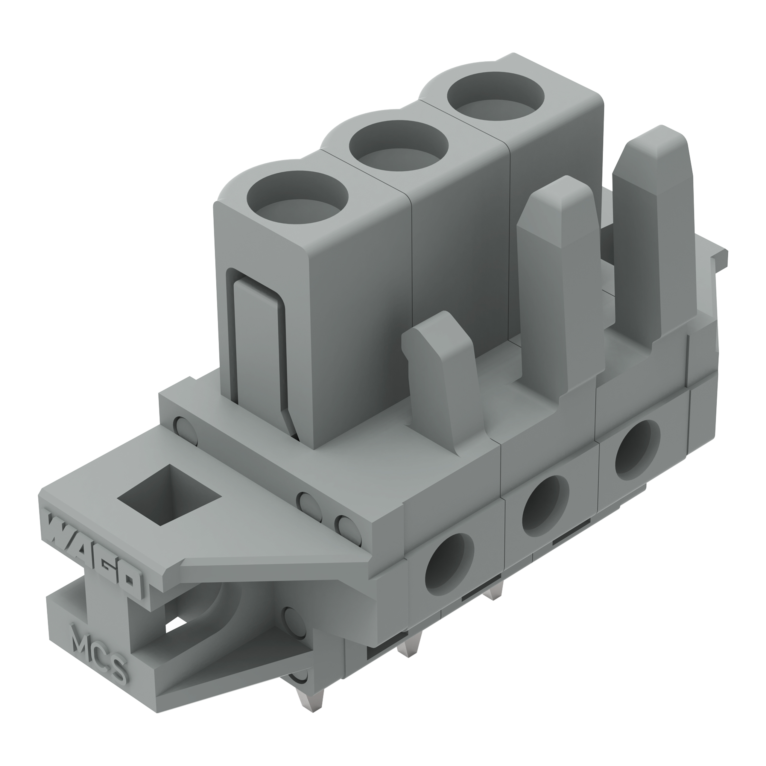 gniazdo THT; konstrukcja prosta; raster 5 mm; 3-bieg.; kołnierz mocujący; pin lutowniczy 0,6 x 1,0 mm; szary
