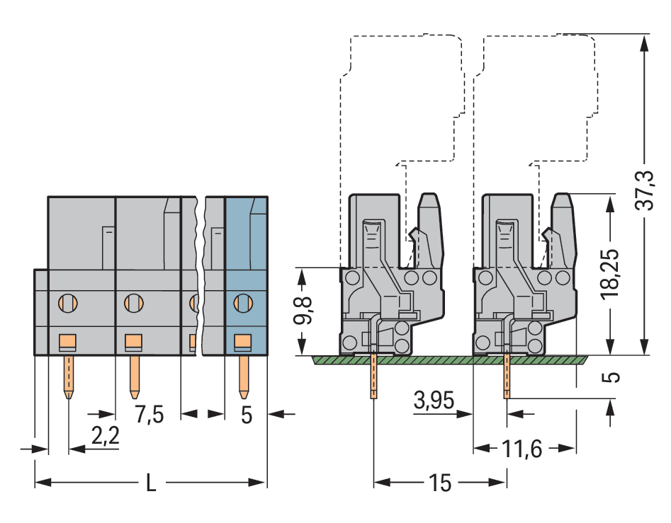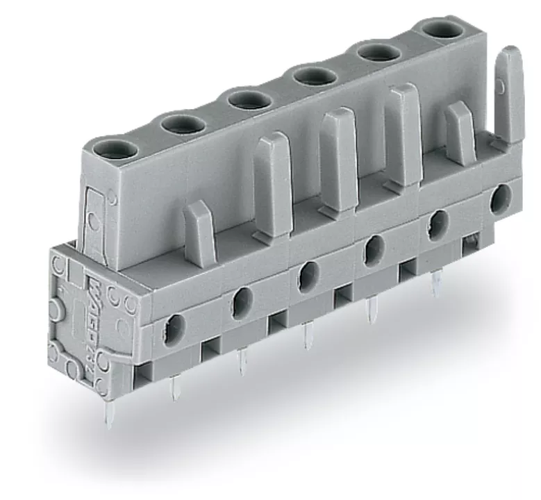 gniazdo THT; konstrukcja prosta; raster 7,5 mm; 2-bieg.; pin lutowniczy 0,6 x 1,0 mm; szary
