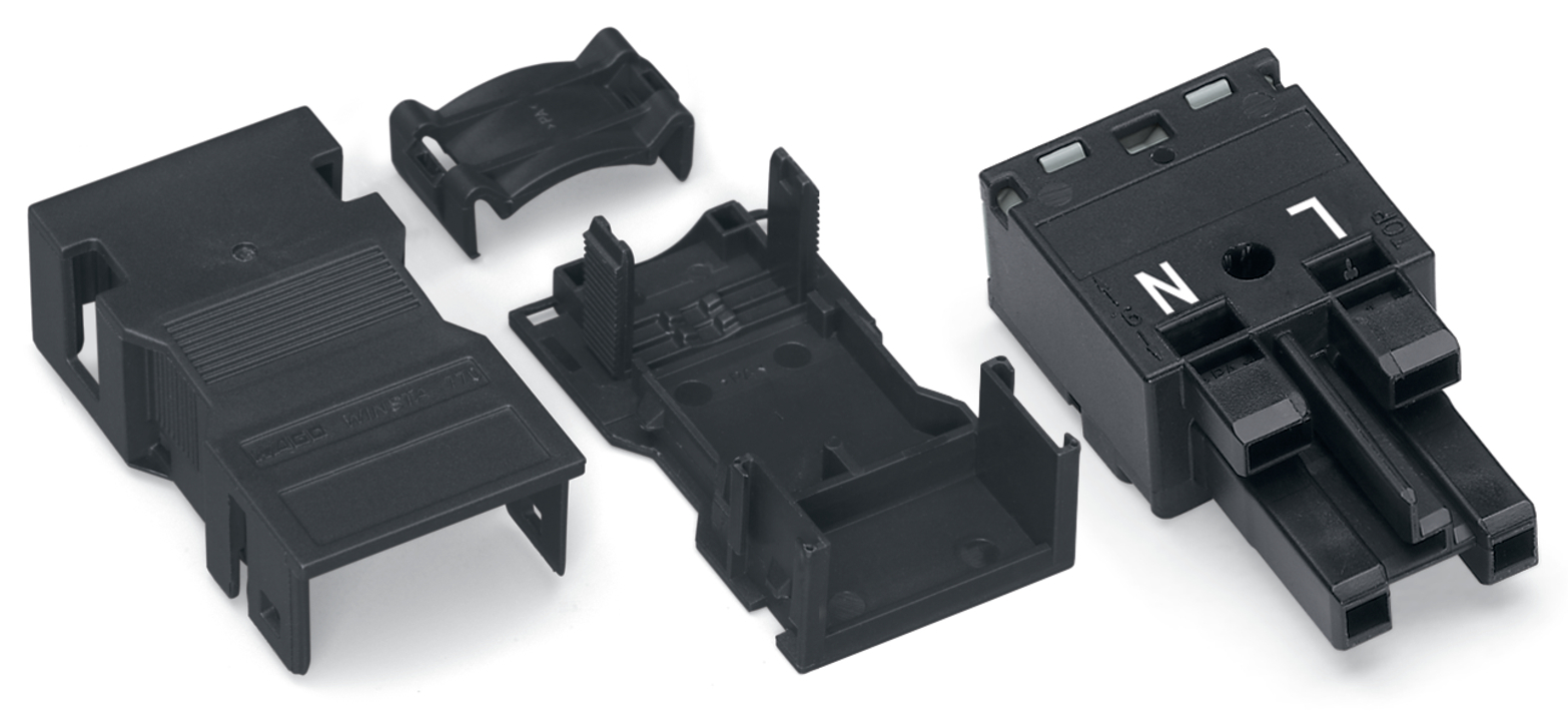 Gniazdo z obudową odciążającą przewody 2-bieg., czarne 770-102/041-000