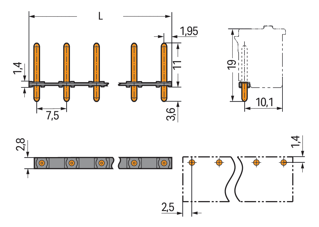 taśma pinowa THT; pin lutowniczy Ø 1,4 mm; konstrukcja prosta; raster 7,5 mm; 2-bieg.; czarny