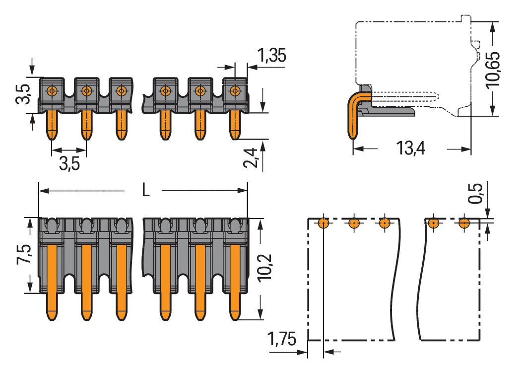 taśma pinowa THR; pin lutowniczy Ø 1,0 mm; konstrukcja kątowa; raster 3,5 mm; 6-bieg.; czarny