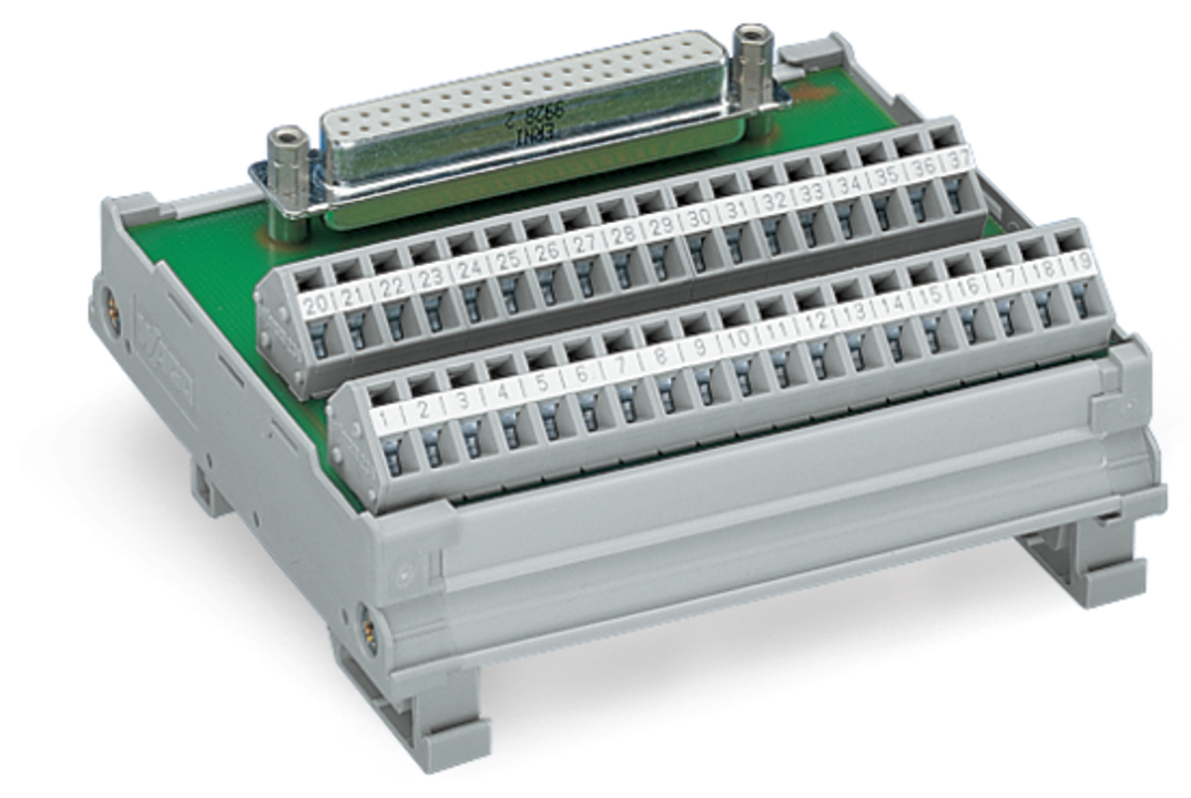 moduł przejściowy; Sub-Min-D; gniazdo; 37-bieg.; wielowtyk przeciwstawny z przyłączem do lutowania; podejście przewodem pionowe; złączki i złącza do PCB, 2-rzędowe; w podstawce montażowej; 2,50 mm²