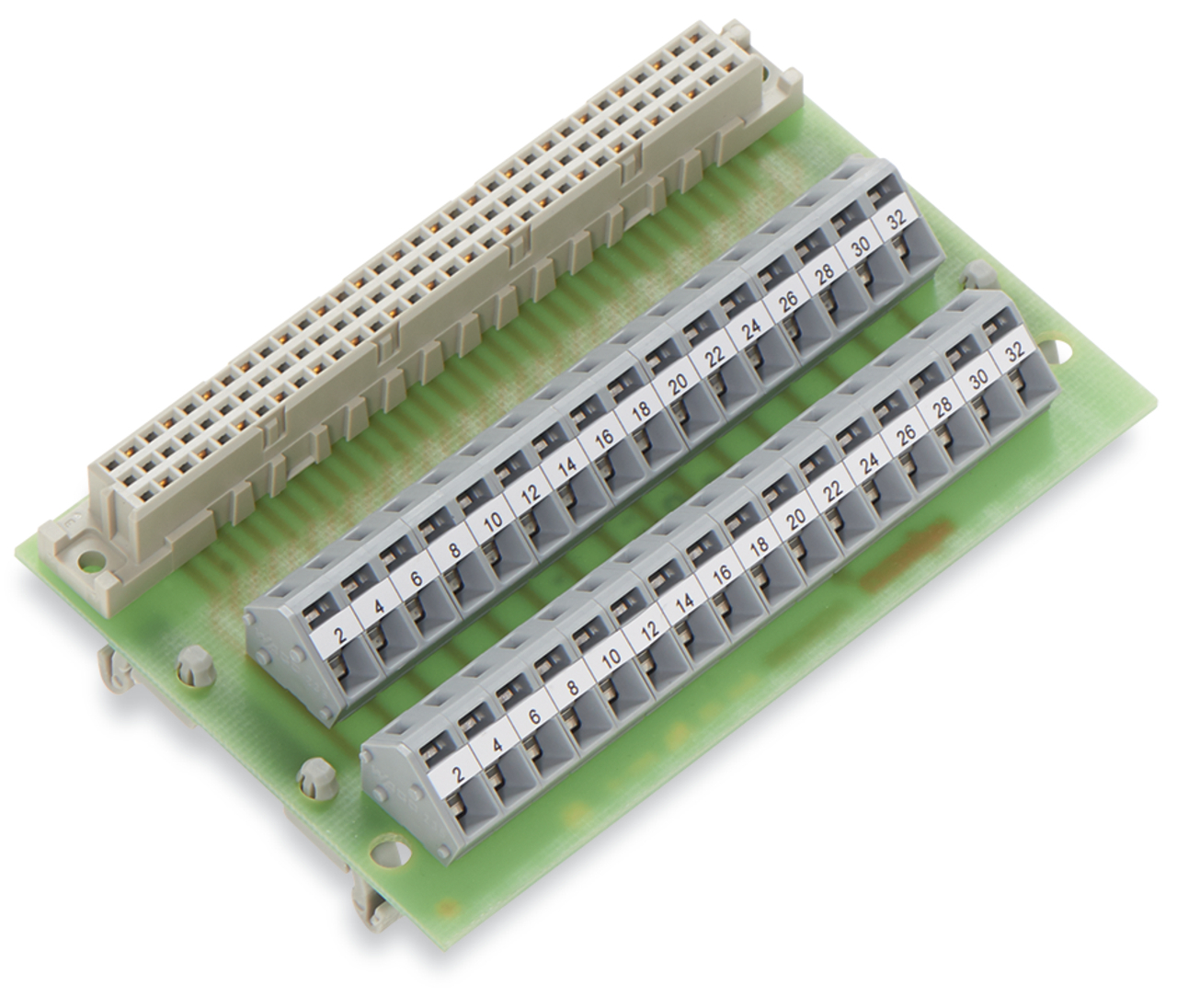 moduł przejściowy; wielowtyk zgodny z DIN 41612; 32-bieg.; wielowtyk przeciwstawny do lutowania; podejście przewodem pionowe; złączki i złącza do PCB, 2-rzędowe; ze stopkami montażowymi; konstrukcja C