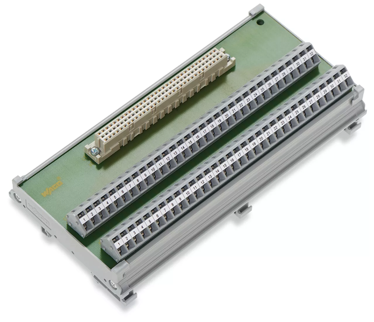 moduł przejściowy; wielowtyk zgodny z DIN 41612; 64-bieg.; wielowtyk przeciwstawny do lutowania; podejście przewodem pionowe; złączki i złącza do PCB, 2-rzędowe; w podstawce montażowej; konstrukcja C; 2,50 mm²