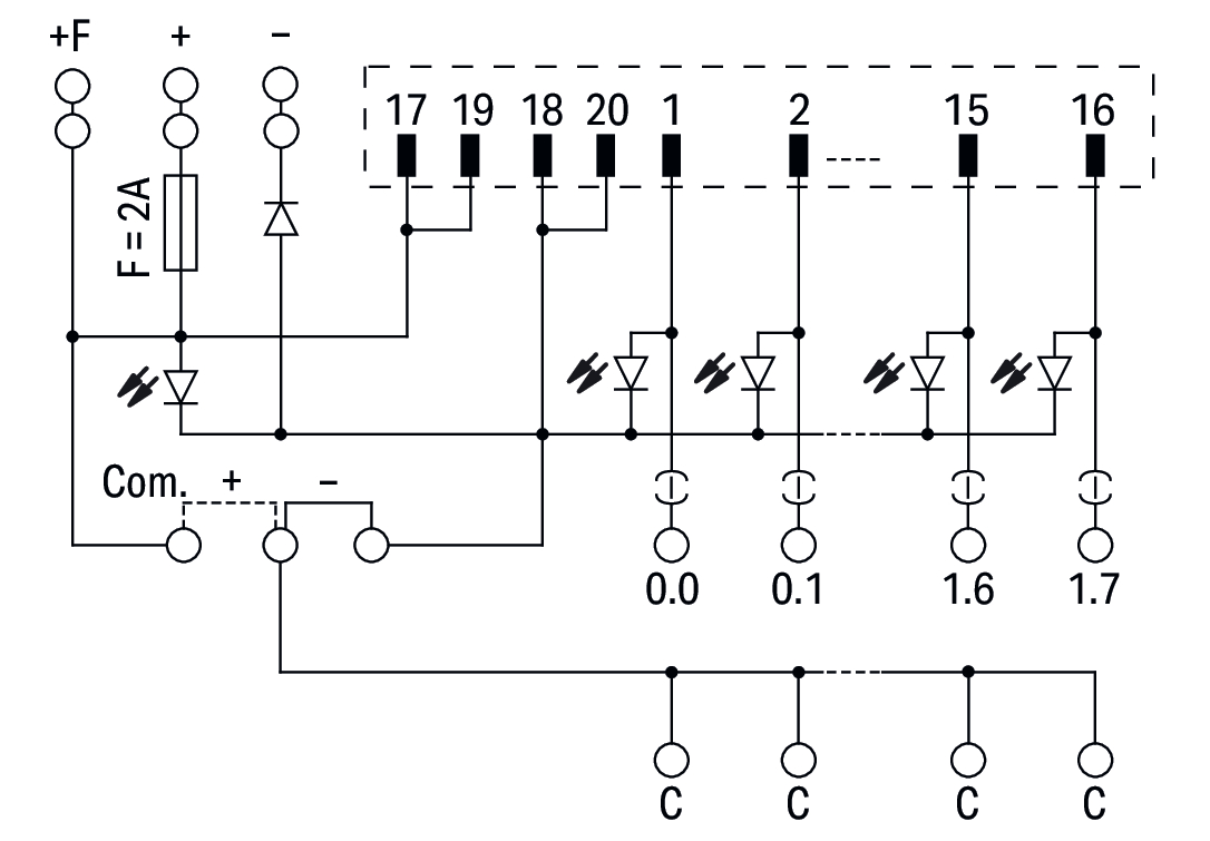 moduł przejściowy do oprzewodowania systemowego; wielowtyk zgodny z DIN 41651; wtyk; 20-bieg.; moduł wejść/wyjść dwustanowych 16-kanałowy; podłączanie 2-przewodowe; w podstawce montażowej