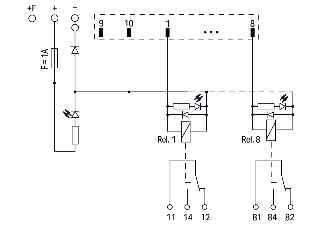 moduł przejściowy do oprzewodowania systemowego; wielowtyk zgodny z DIN 41651; wtyk; 10-bieg.; moduł wyjść przekaźnikowych 8-kanałowy; 1 zestyk przełączny; złącza do PCB 3-piętrowe; w podstawce montażowej; 2,50 mm²