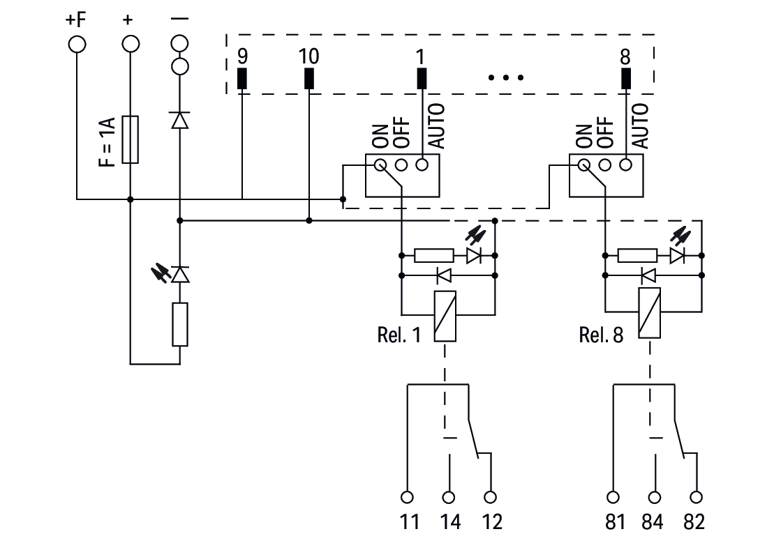 moduł przejściowy do oprzewodowania systemowego; wielowtyk zgodny z DIN 41651; wtyk; 10-bieg.; moduł wyjść przekaźnikowych 8-kanałowy; 1 zestyk przełączny; złącza do PCB 3-piętrowe; z ręcznym pobudzeniem; w podstawce montażowej; 2,50 mm²