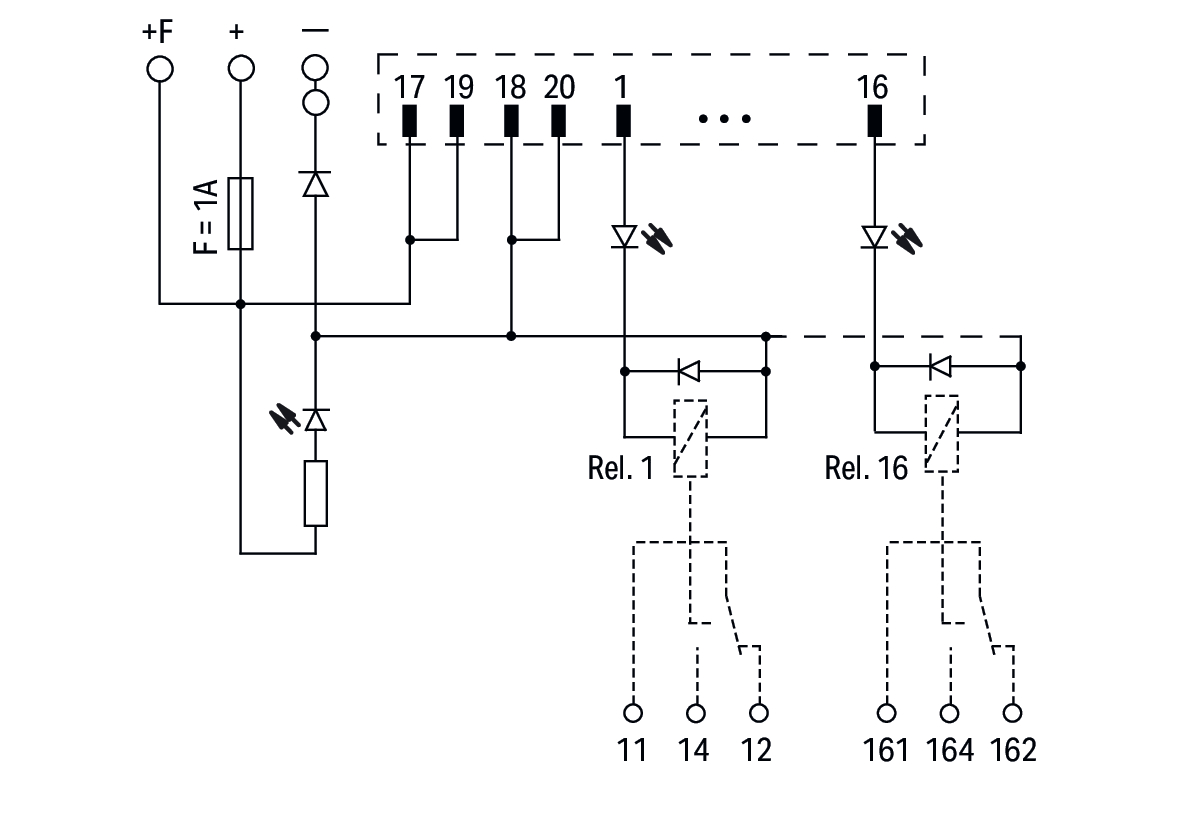 moduł przejściowy do oprzewodowania systemowego; wielowtyk zgodny z DIN 41651; wtyk; 20-bieg.; moduł wyjść przekaźnikowych 16-kanałowy; 1 zestyk przełączny; złącza do PCB 2-piętrowe; bez przekaźnika; w podstawce montażowej; 2,50 mm²