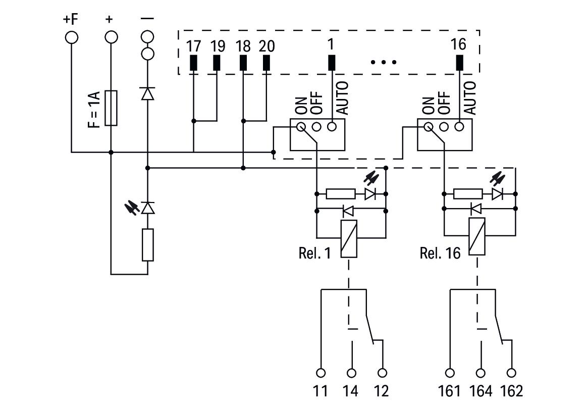 moduł przejściowy do oprzewodowania systemowego; wielowtyk zgodny z DIN 41651; wtyk; 20-bieg.; moduł wyjść przekaźnikowych 16-kanałowy; 1 zestyk przełączny; złącza do PCB 3-piętrowe; z ręcznym pobudzeniem; w podstawce montażowej; 2,50 mm²