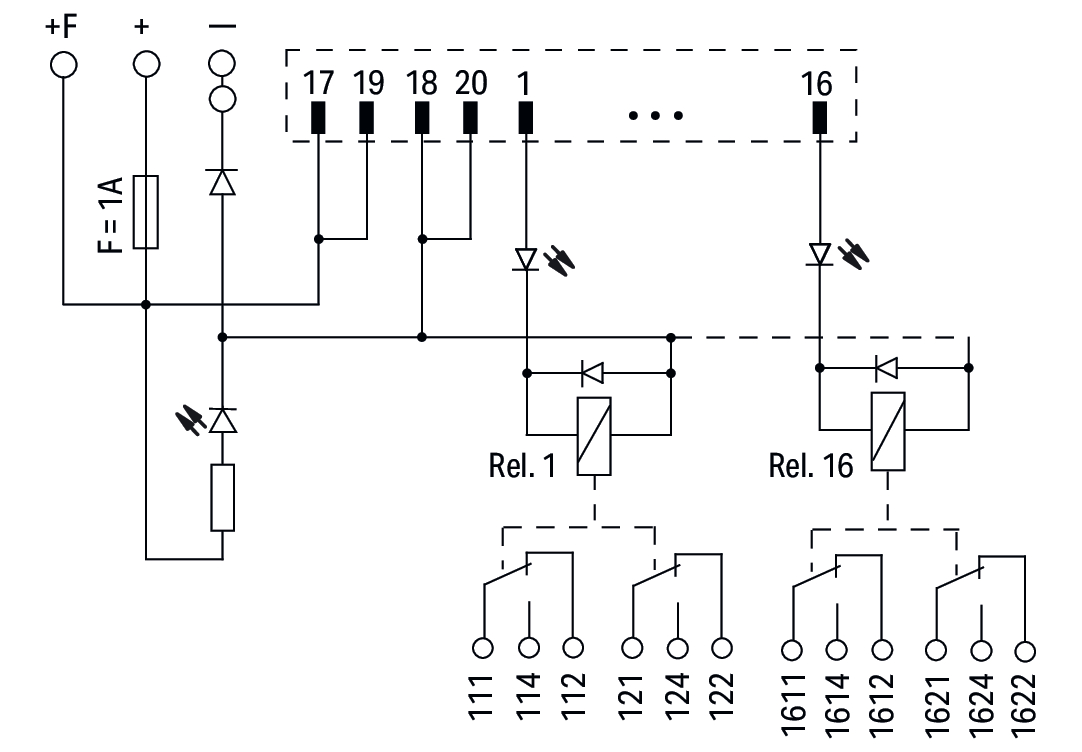 moduł przejściowy do oprzewodowania systemowego; wielowtyk zgodny z DIN 41651; wtyk; 20-bieg.; moduł wyjść przekaźnikowych 16-kanałowy; 2 x zestyk przełączny; złącza do PCB 2-piętrowe; w podstawce montażowej; 2,50 mm²