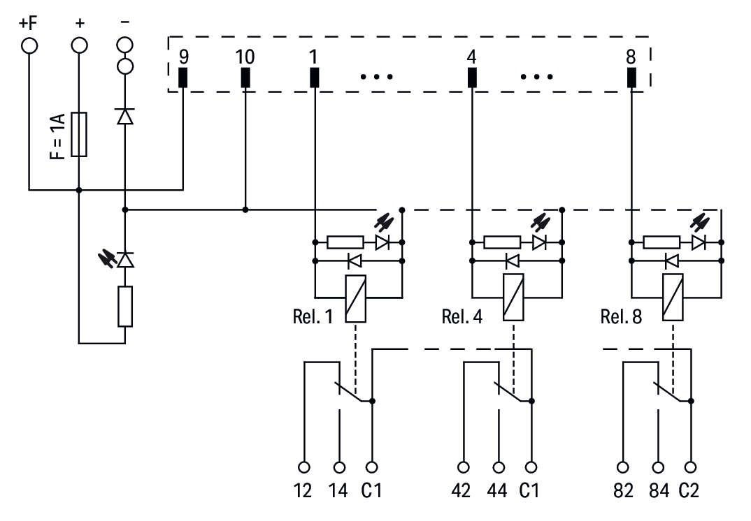 moduł przejściowy do oprzewodowania systemowego; wielowtyk zgodny z DIN 41651; wtyk; 10-bieg.; moduł wyjść przekaźnikowych 8-kanałowy; 1 zestyk przełączny; złącza do PCB 3-piętrowe; w podstawce montażowej