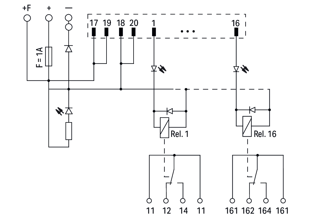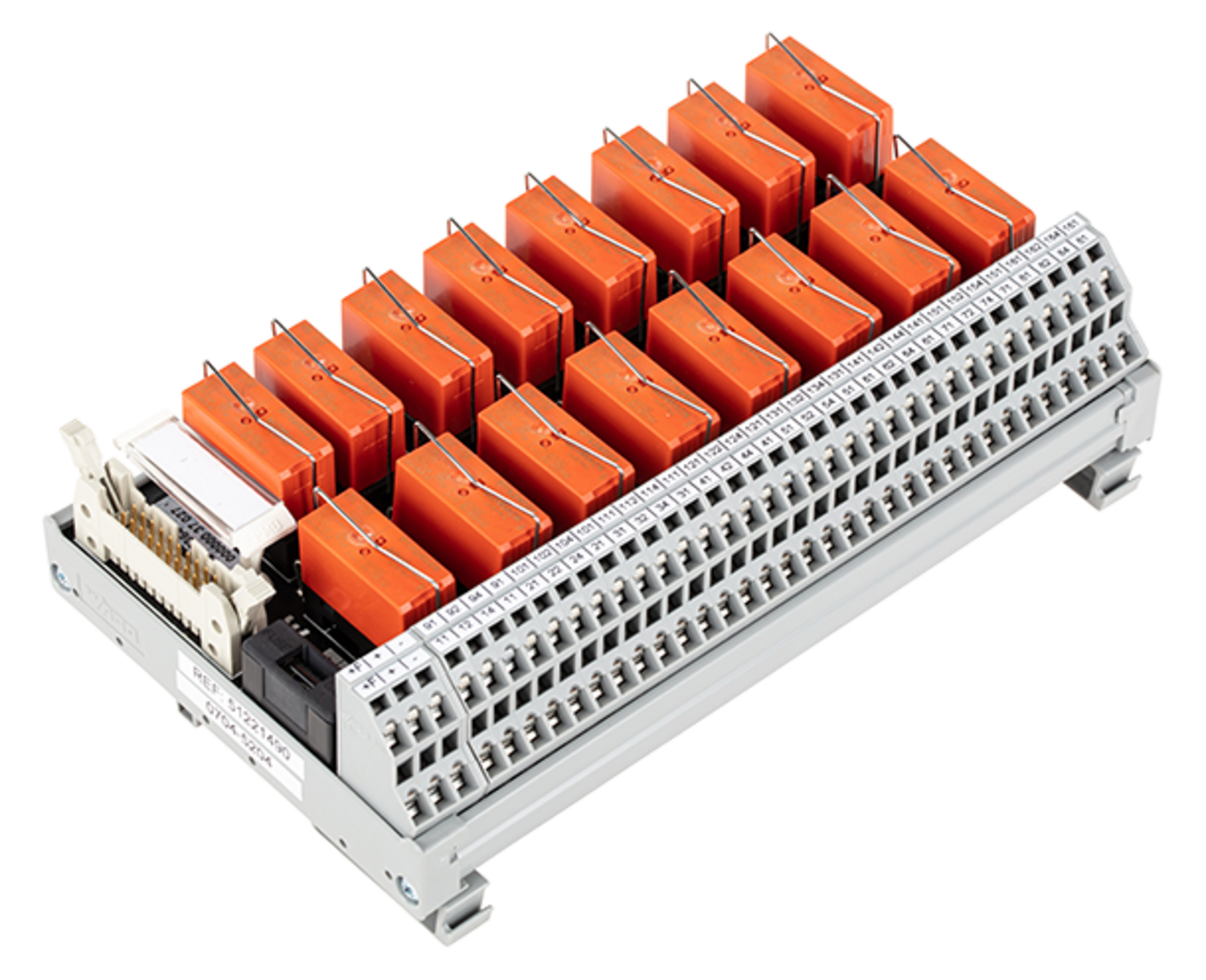 moduł przejściowy do oprzewodowania systemowego; wielowtyk zgodny z DIN 41651; wtyk; 20-bieg.; moduł wyjść przekaźnikowych 16-kanałowy; 1 zestyk przełączny; złącza do PCB 2-piętrowe; do obciążeń DC; w podstawce montażowej