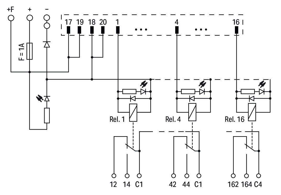 moduł przejściowy do oprzewodowania systemowego; wielowtyk zgodny z DIN 41651; wtyk; 20-bieg.; moduł wyjść przekaźnikowych 16-kanałowy; 1 zestyk przełączny; złącza do PCB 3-piętrowe; w podstawce montażowej