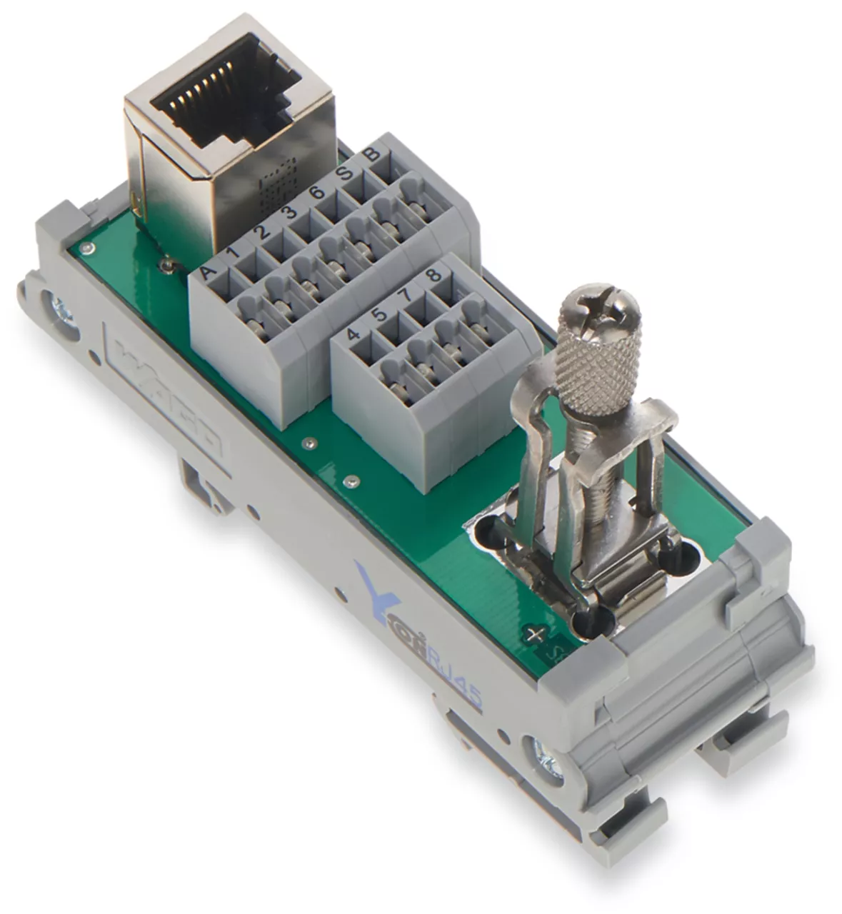moduł przejściowy; RJ-45; z magistralą obiektową; złączki i złącza do PCB, 2-rzędowe; Cat. 5; w podstawce montażowej; z podłączeniem ekranu; z obejmą zaciskową do ekranów; 1,50 mm²