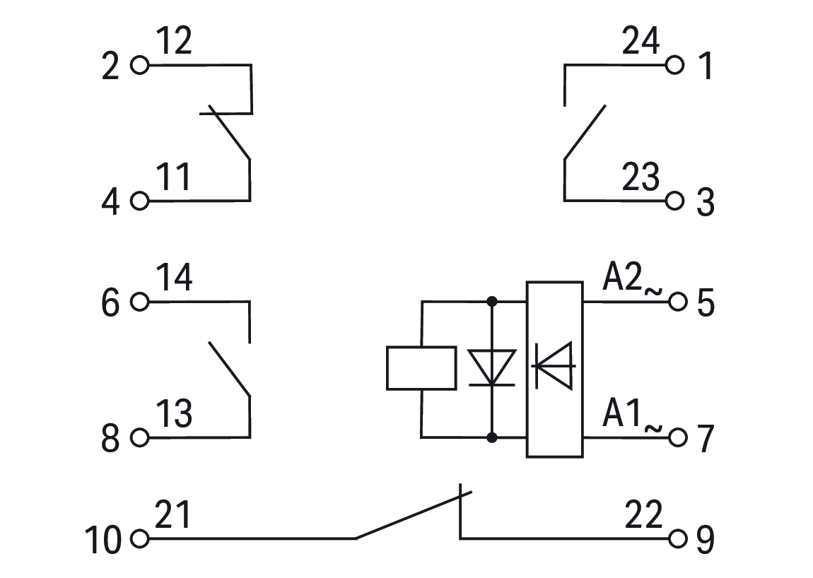 przekaźnik; znamionowe nap. wej. 24 V … 230 V AC/DC; 2 zestyki zwierne i 2 rozwierne; maksymalny prąd długotrwały 3 A; sygnalizacja statusu zielona; szerokość 25 mm