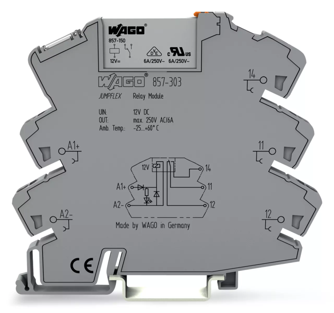 przekaźnik; znamionowe napięcie wejściowe 12 V DC; 1 zestyk przełączny; maksymalny prąd długotrwały 6 A; sygnalizacja statusu żółta; szerokość 6 mm; 2,50 mm²; szary