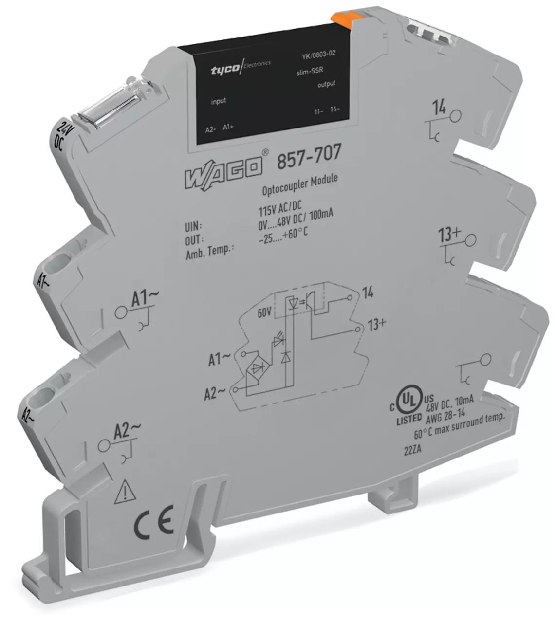 przekaźnik półprzewodnikowy; znamionowe napięcie wejściowe 115 V AC/DC; zakres napięcia wyjściowego 0 … 48 V DC; maksymalny prąd długotrwały 0,1 A; podłączanie 2-przewodowe; sygnalizacja statusu żółta; szerokość 6 mm; szary