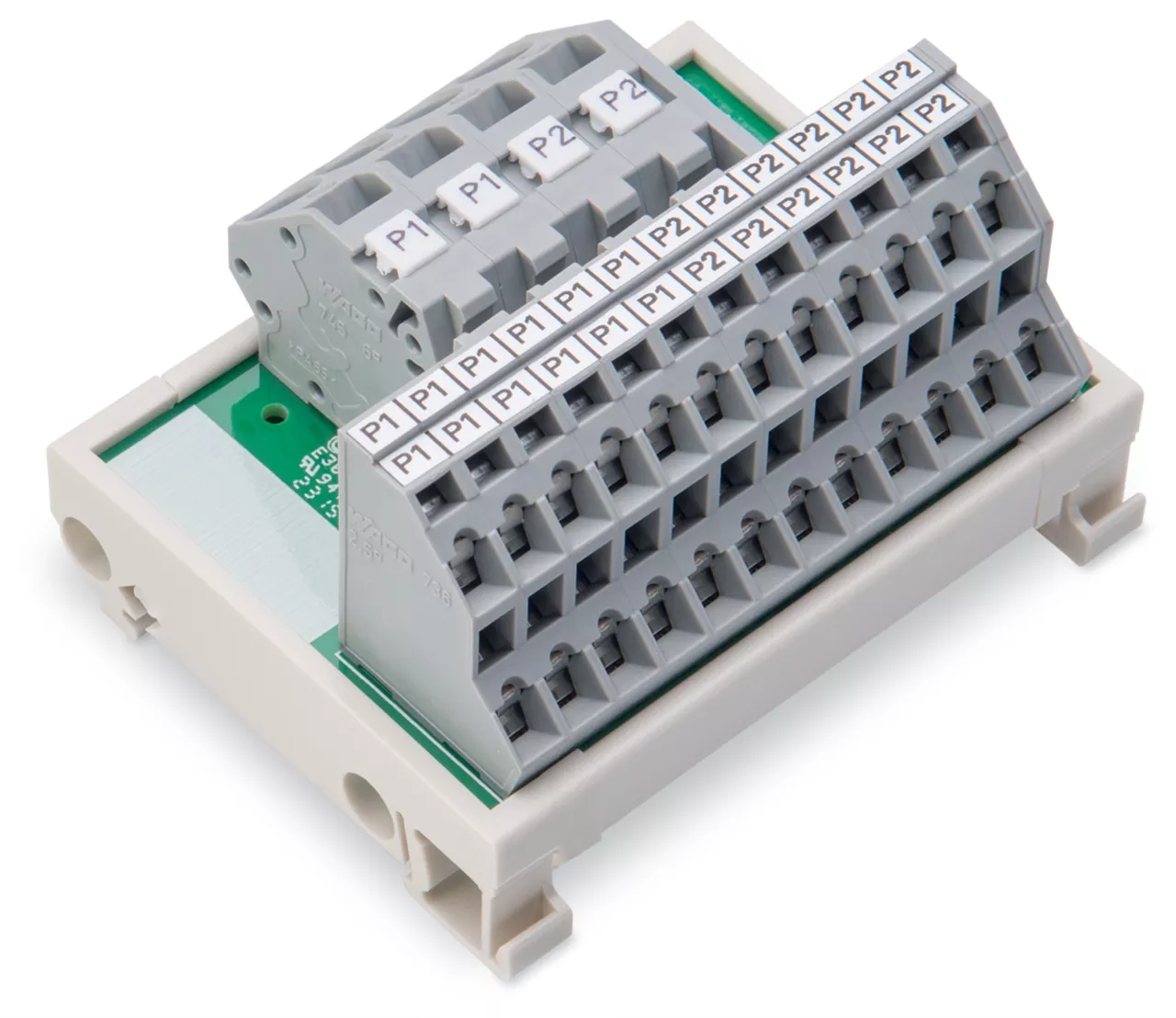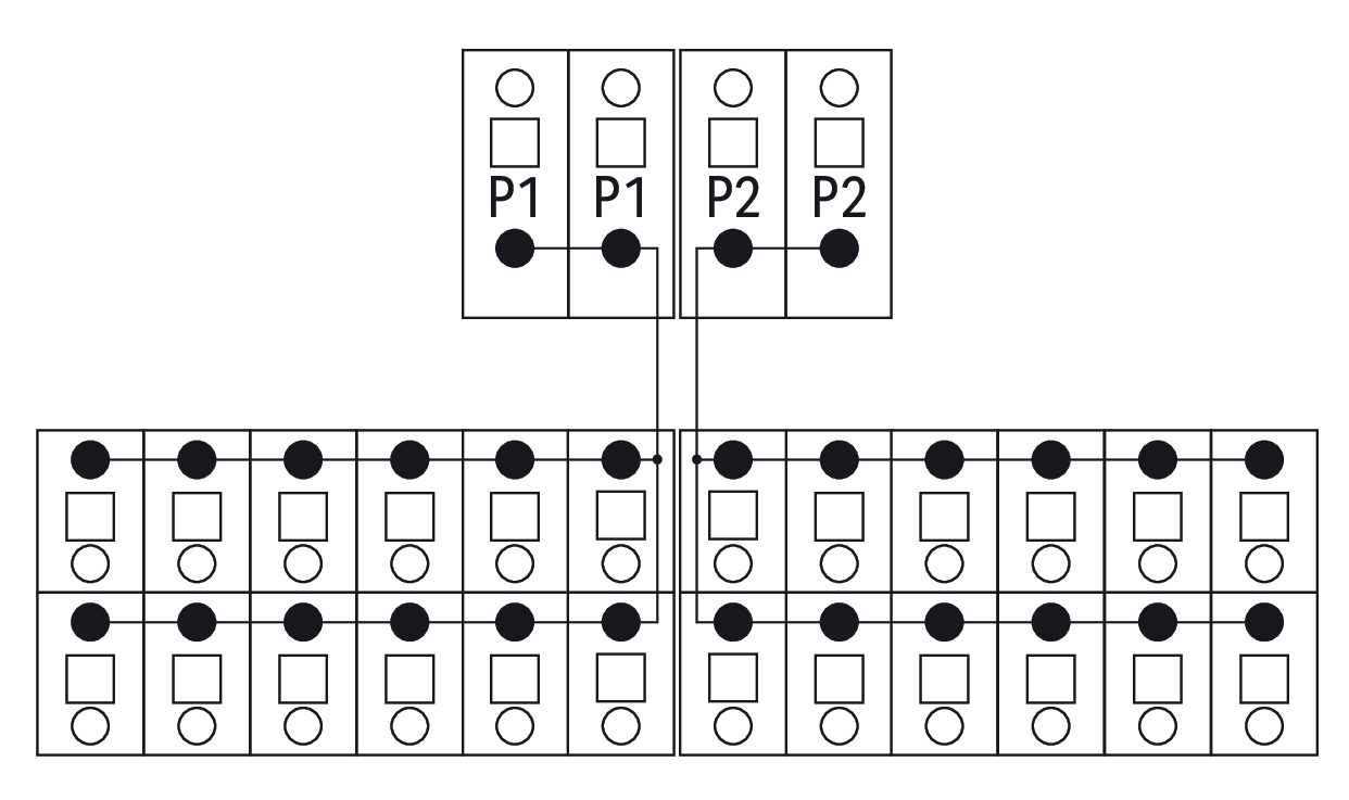 moduł rozdzielający potencjały; 2 potencjały; po 2 zaciski zasilające; przekrój przewodu do 6 mm²; po 12 zacisków wyjściowych; przekrój przewodu do 2,5 mm²