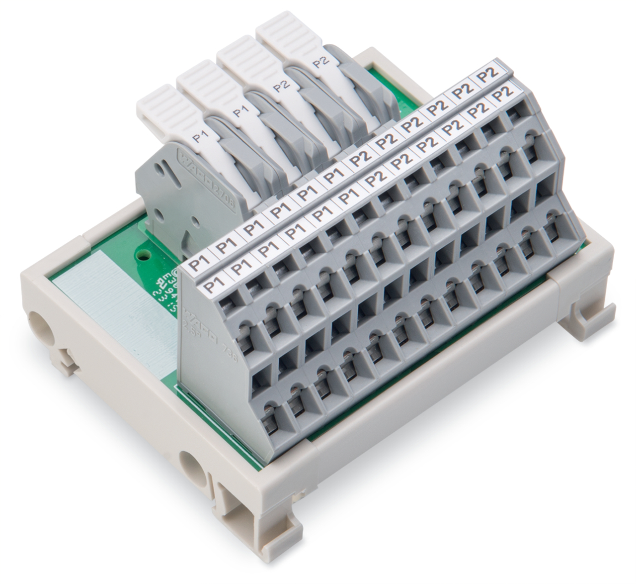 moduł rozdzielający potencjały; 2 potencjały; po 2 zaciski zasilające; przekrój przewodu do 6 mm²; z dźwignią; po 12 zacisków wyjściowych; przekrój przewodu do 2,5 mm²; szary