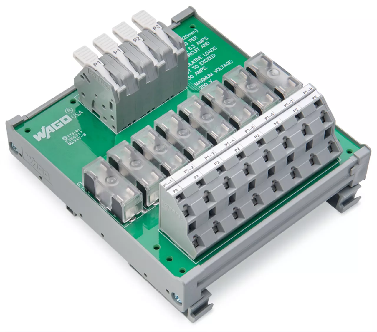 moduł rozdzielający potencjały; 2 potencjały; po 2 zaciski zasilające; przekrój przewodu do 6 mm²; z dźwignią; po 8 zacisków wyjściowych; przekrój przewodu do 2,5 mm²; szary