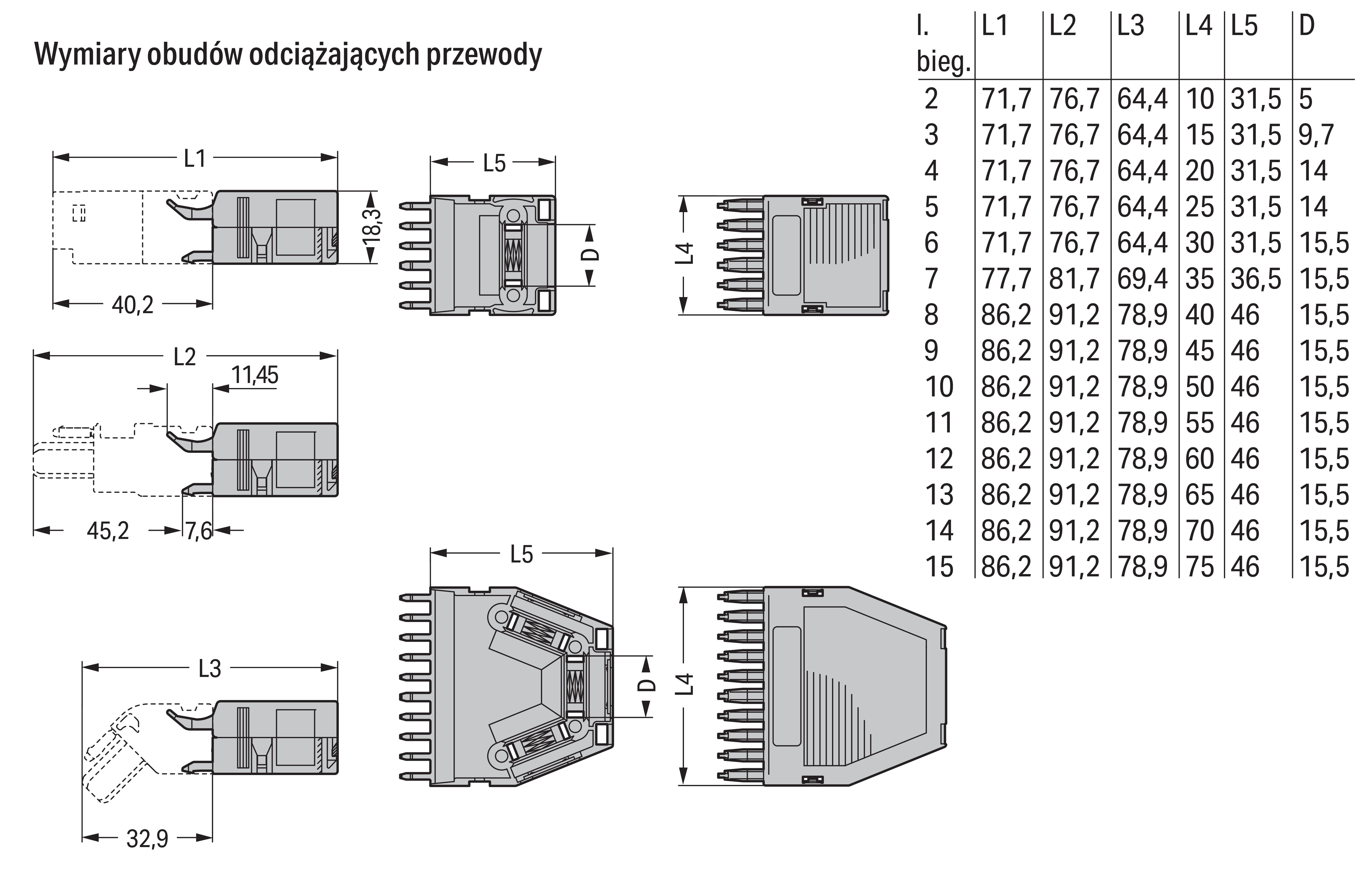 obudowa odciążająca przewody; do gniazd i wtyków; 2-częściowa; raster 5 mm; 7-bieg.; szary