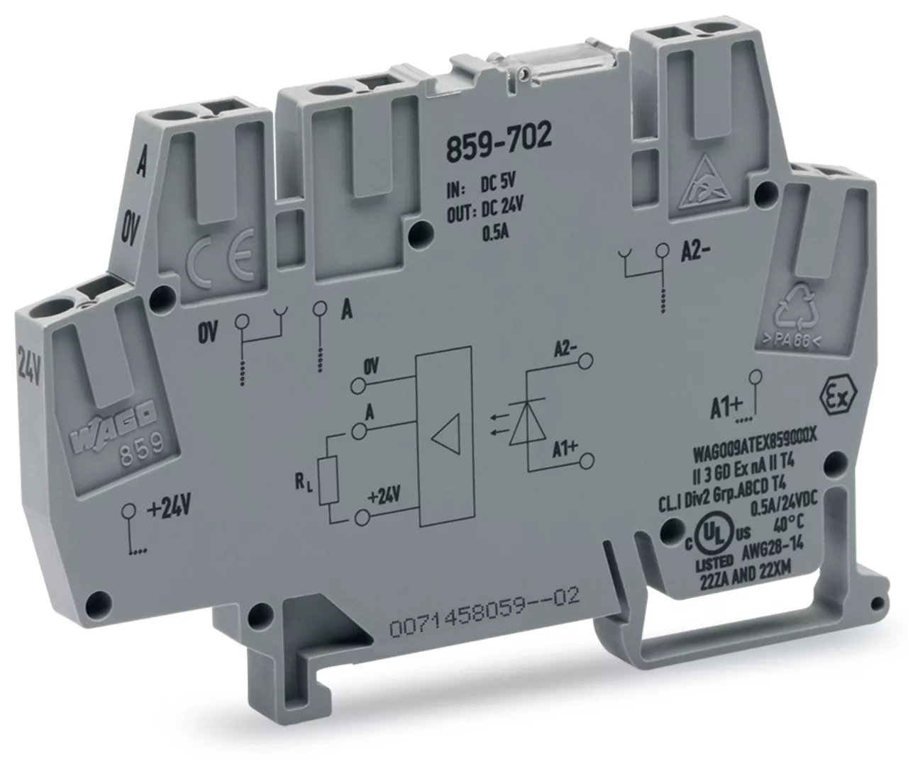 optoseparator; znamionowe napięcie wejściowe 5 V DC; zakres napięcia wyjściowego 15 … 30 V DC; maksymalny prąd długotrwały 1 A; podłączanie 3-przewodowe/załączanie potencjałem niskim; częstotliwość 15 kHz; sygnalizacja statusu czerwony; szerokość 6 mm; szary