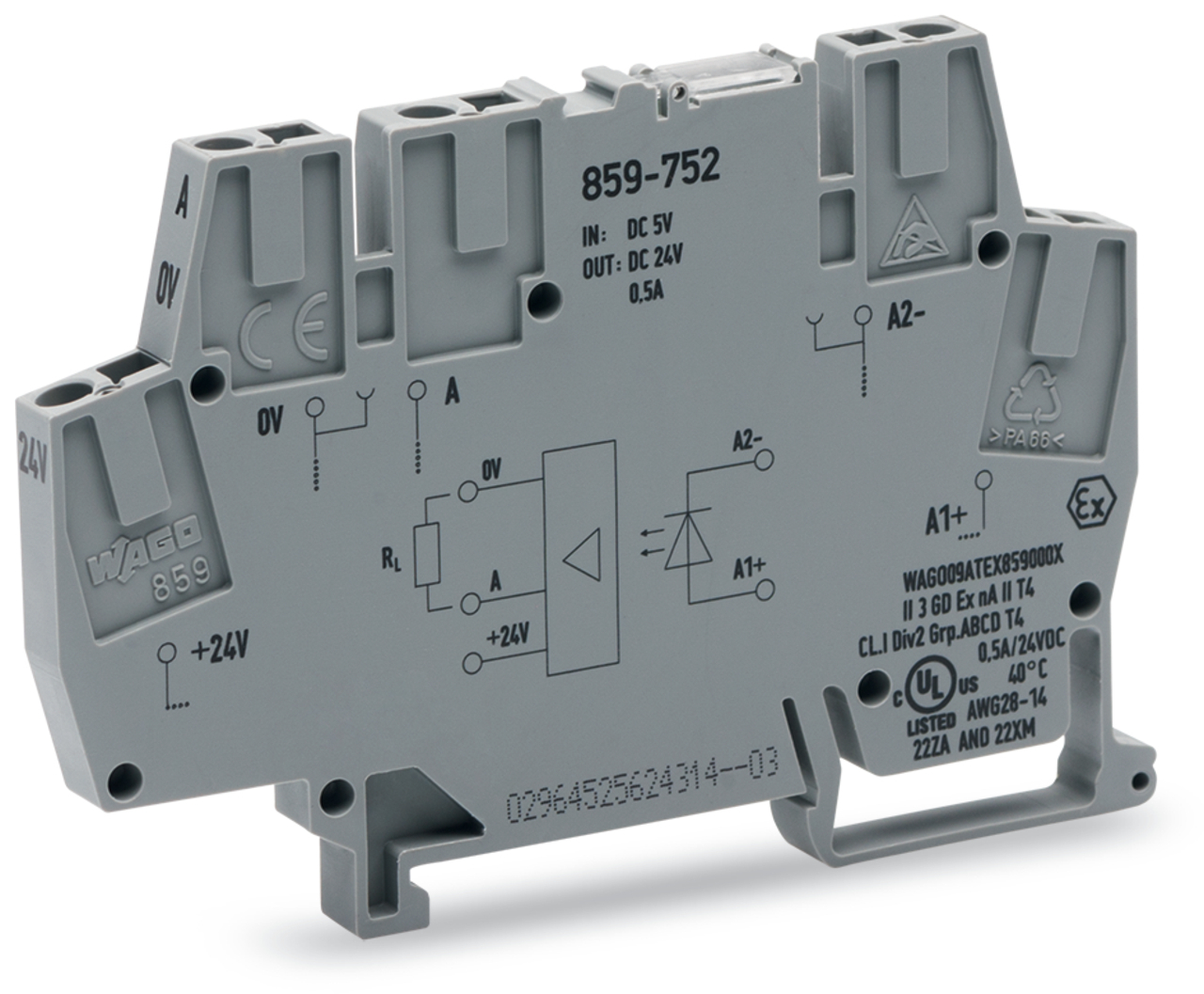 optoseparator; znamionowe napięcie wejściowe 5 V DC; zakres napięcia wyjściowego 20 … 30 V DC; maksymalny prąd długotrwały 0,5 A; podłączanie 3-przewodowe/załączanie potencjałem wysokim; częstotliwość 10 kHz; sygnalizacja statusu czerwony; szerokość 6 mm; szary