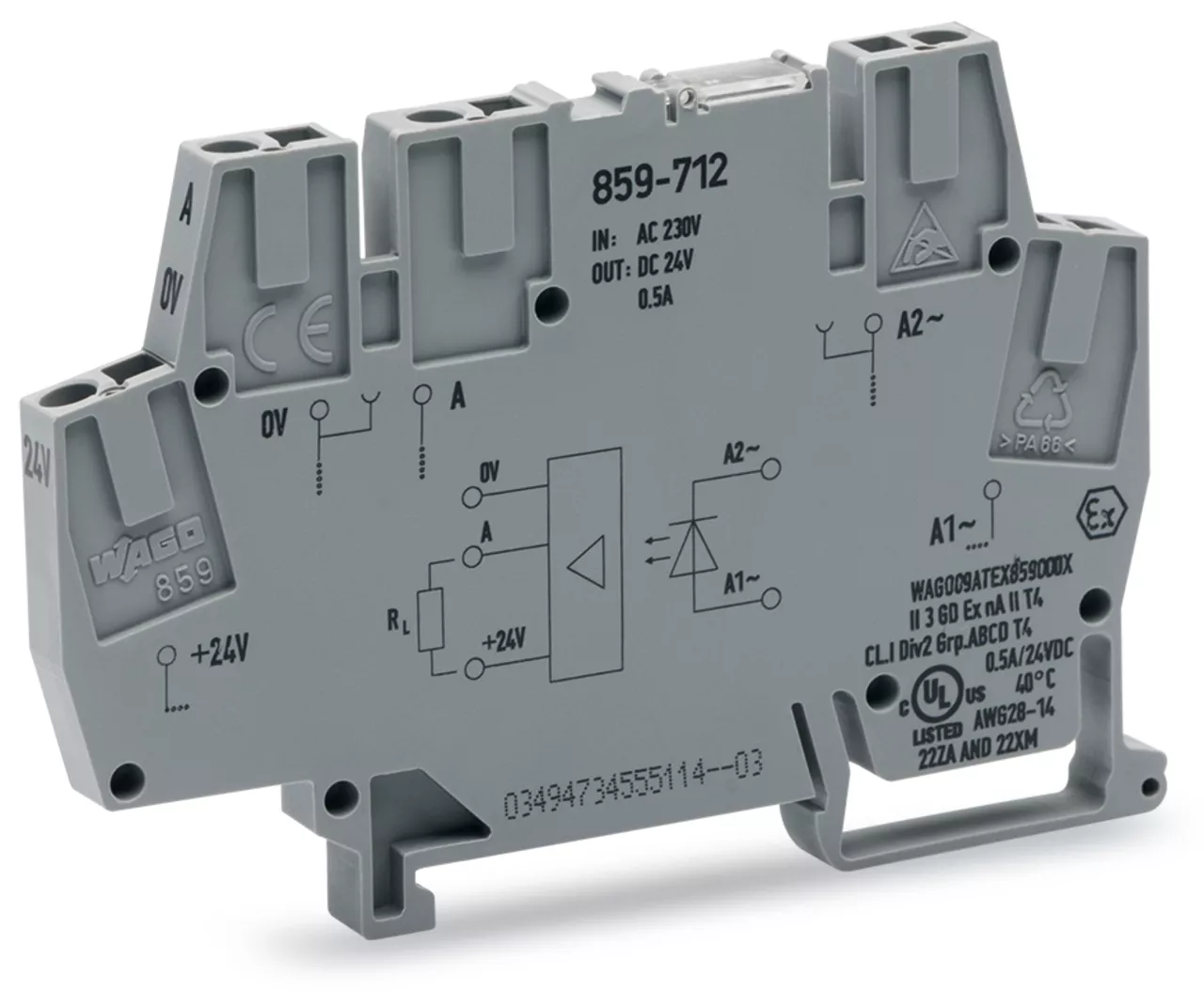 optoseparator; znamionowe napięcie wejściowe 230 V AC; zakres napięcia wyjściowego 15 … 30 V DC; maksymalny prąd długotrwały 1 A; podłączanie 3-przewodowe/załączanie potencjałem niskim; sygnalizacja statusu czerwony; szerokość 6 mm; szary