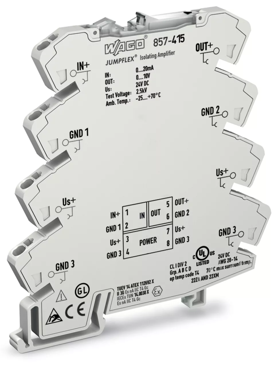 Przetwornik separacyjny ze wzmocnieniem, prądowy sygnał wejściowy, napięciowy sygnał wyjściowy, napięcie zasilania 24 V DC, szerokość 6 mm, 2,50 mm² 857-415
