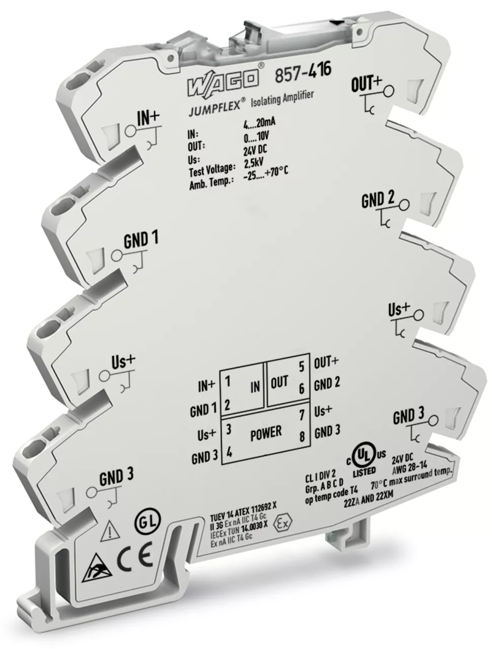 Przetwornik separacyjny ze wzmocnieniem, prądowy sygnał wejściowy, napięciowy sygnał wyjściowy, napięcie zasilania 24 V DC, szerokość 6 mm, 2,50 mm² 857-416