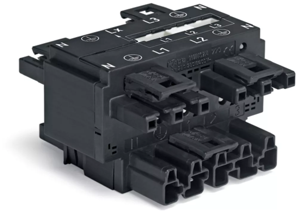 rozgałęźnik trójfazowy na jednofazowy; z możliwością wyboru fazy; 5-bieg./3-bieg.; kodowanie A; 1 wejście; 5 wyjść; czarny