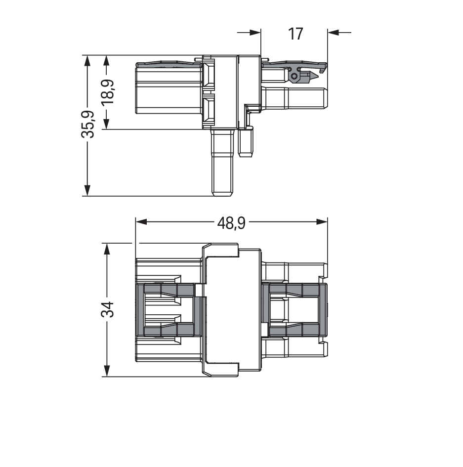 rozgałęźnik typu T; 3-bieg.; kodowanie A; 1 wejście; 2 wyjścia; 2 zaczepy ryglujące; biały
