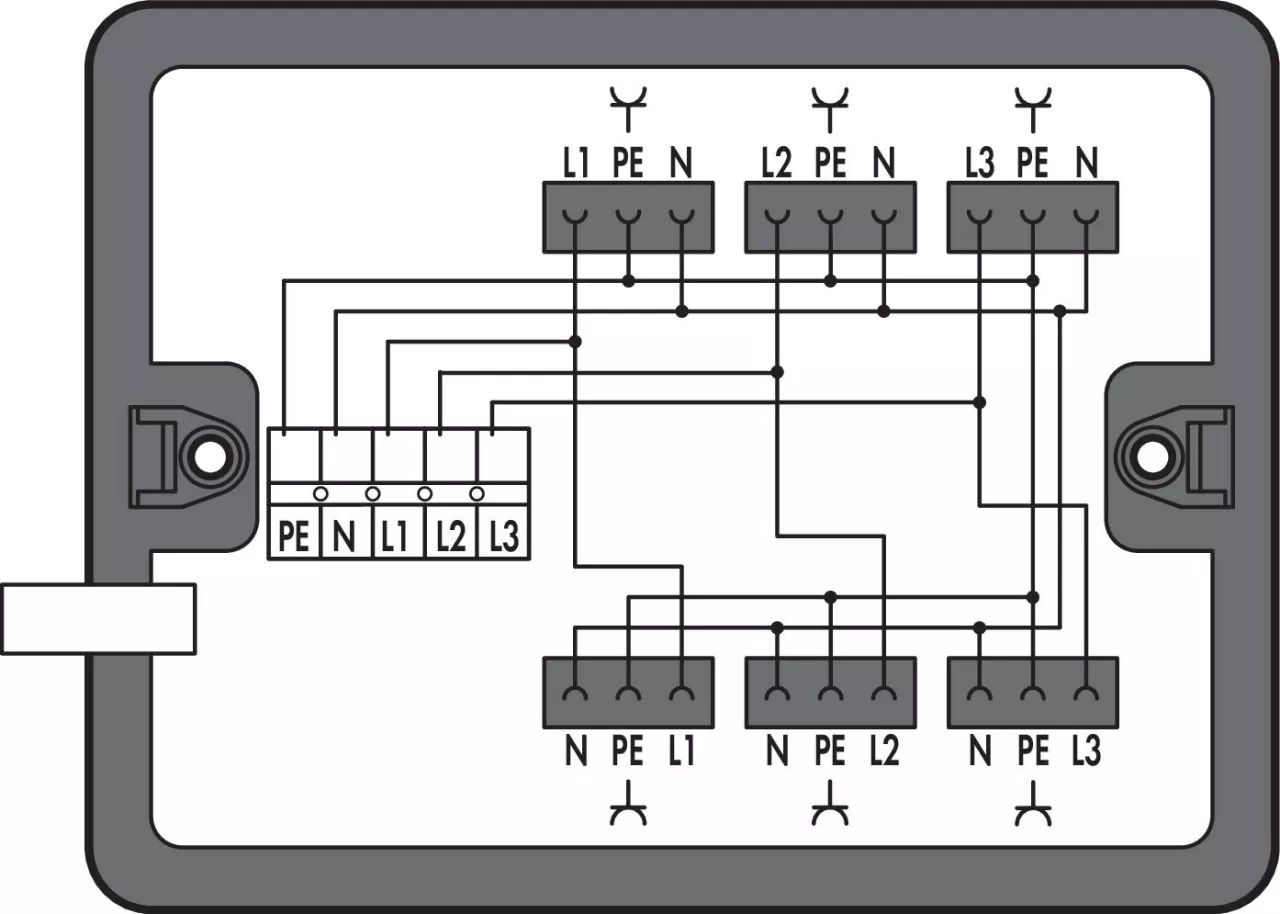 skrzynka rozdzielcza; trójfazowe/jednofazowe (400 V/230 V); rozdzielenie zasilania; 1 wejście; 6 wyjść; kodowanie A; MIDI; czarny