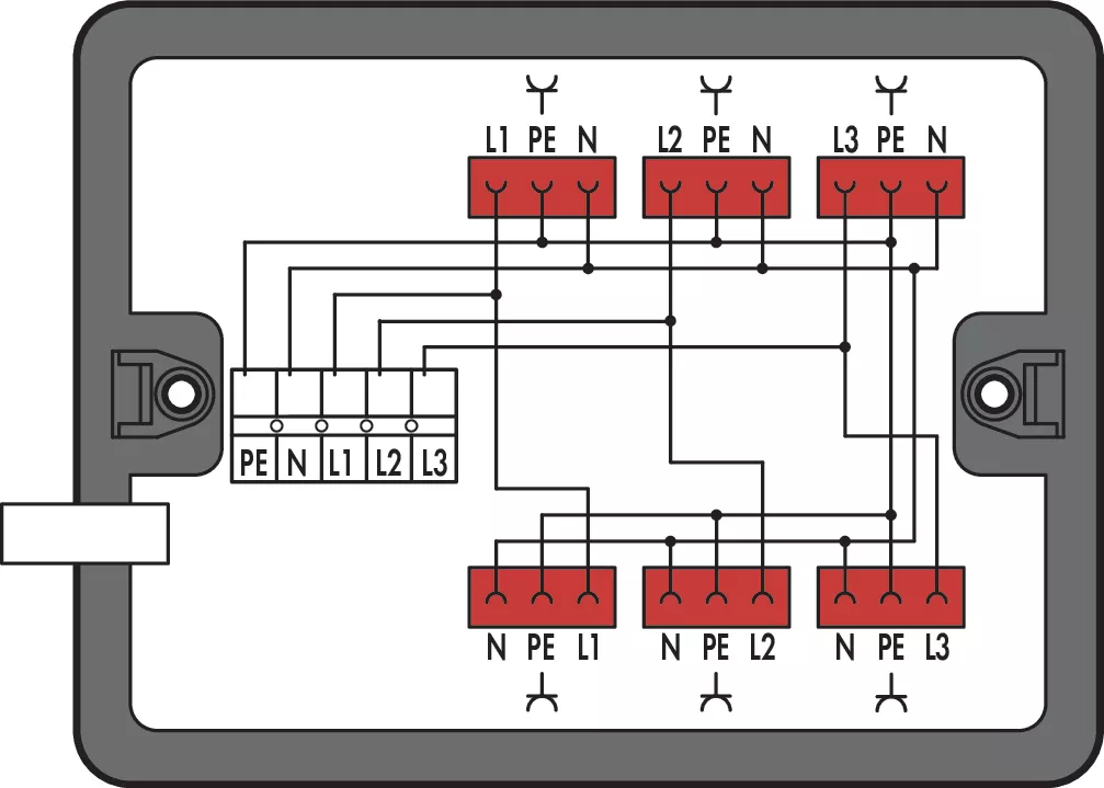 skrzynka rozdzielcza; trójfazowe/jednofazowe (400 V/230 V); rozdzielenie zasilania; 1 wejście; 6 wyjść; kodowanie P; MIDI; czarny