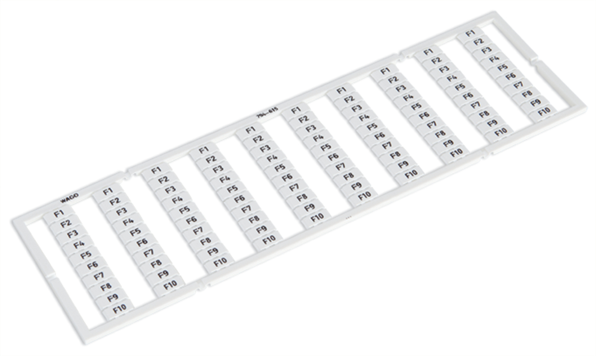 mata oznacznikowa WMB; jako karta; z nadrukiem; F1, ..., F10 (10x); z możliwością rozciągnięcia z 5 mm do 5,2 mm; nadruk pionowo; do montażu zatrzaskowego; biały