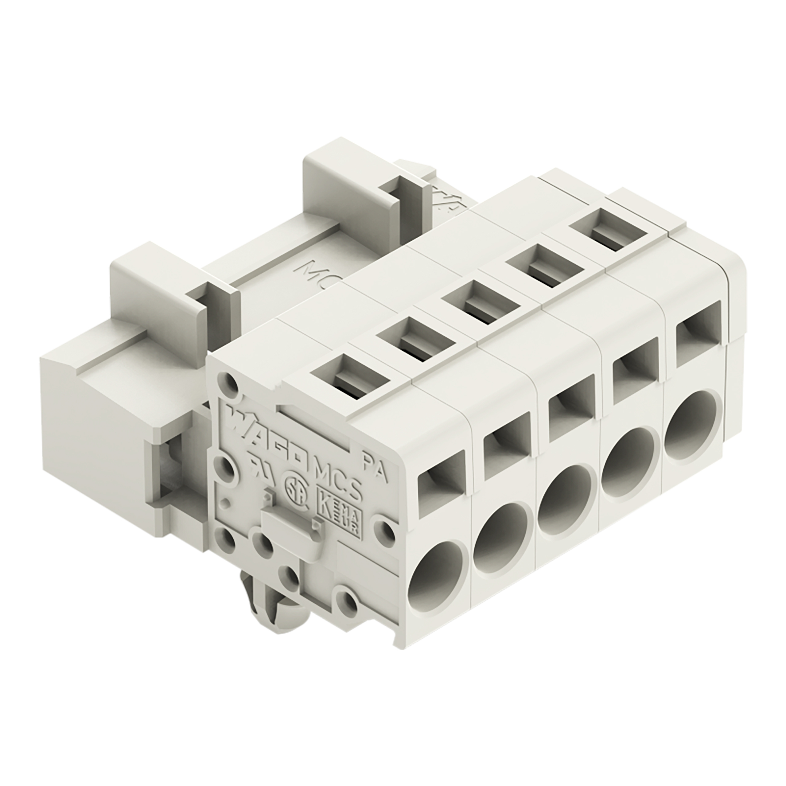 wtyk 1-przewodowy; CAGE CLAMP®; 2,5 mm²; raster 5 mm; 5-bieg.; 100% ochrona przed błędnym połączeniem; TS 35/montaż na płycie; stopki zatrzaskowe; 2,50 mm²; jasnoszary