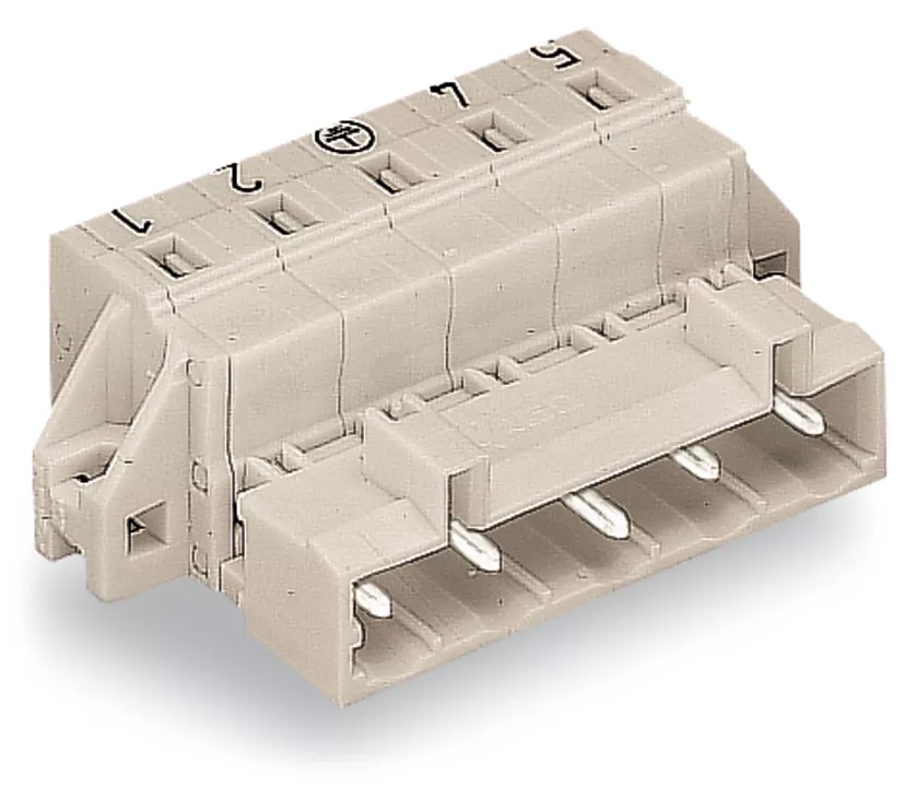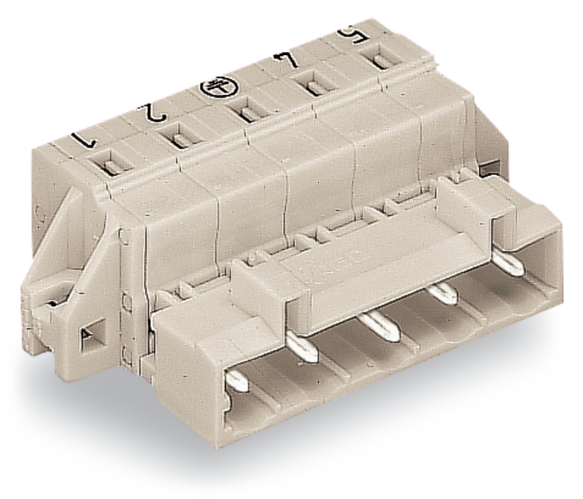 wtyk 1-przewodowy; CAGE CLAMP®; 2,5 mm²; raster 7,5 mm; 5-bieg.; wyprzedzający styk PE; 100% ochrona przed błędnym połączeniem; kołnierz mocujący; z nadrukiem bezpośrednim; 2,50 mm²; jasnoszary