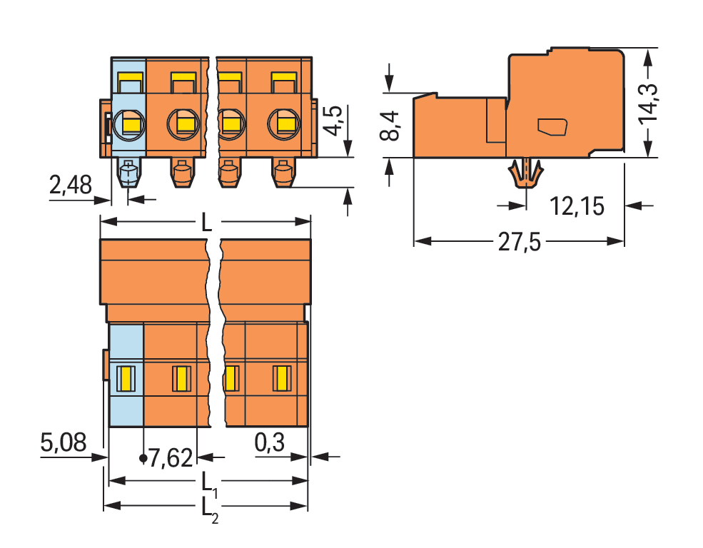 wtyk 1-przewodowy; CAGE CLAMP®; 2,5 mm²; raster 7,62 mm; 2-bieg.; TS 35/montaż na płycie; stopki zatrzaskowe; 2,50 mm²; pomarańczowy