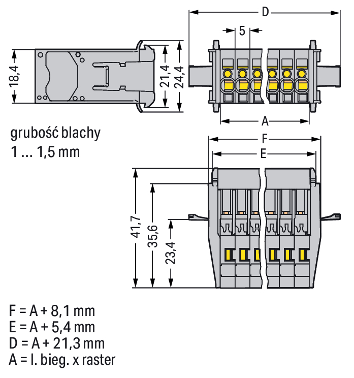 wtyk 1-przewodowy; CAGE CLAMP®; 4 mm²; raster 5 mm; 13-bieg.; uchwyt Snap-In; 4,00 mm²; szary