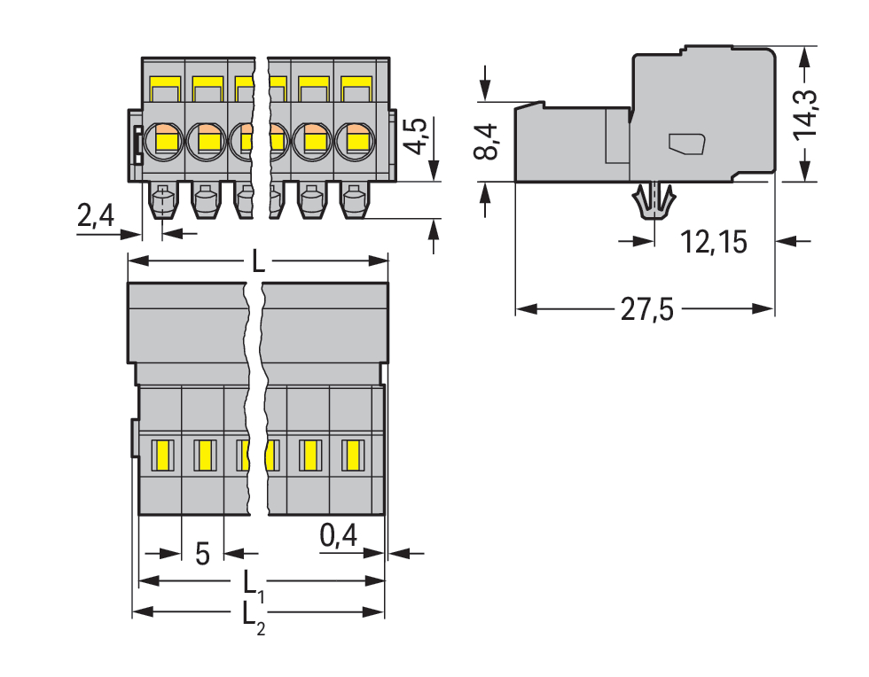 wtyk 1-przewodowy; CAGE CLAMP®; 2,5 mm²; raster 5 mm; 14-bieg.; TS 35/montaż na płycie; stopki zatrzaskowe; szary